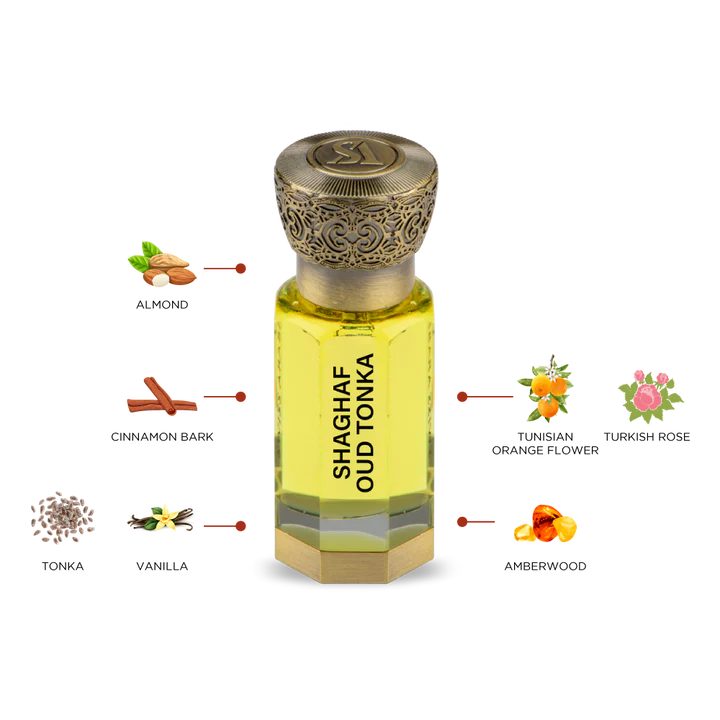 Feel the captivating embrace of cinnamon bark, Tunisian orange flower, and Turkish rose in the heart, as they intertwine to create a symphony of sensuality and allure. The base notes of tonka, vanilla, and amberwood add depth and richness, leaving a trail of captivating elegance. Tonka provides a warm and addictive embrace, while vanilla adds a touch of sweetness. Amberwood brings an earthy and woody allure, completing the captivating composition. Shaghaf Oud Tonka invites you to embrace the captivating elegance it embodies. Let its enchanting fusion of scents reflect your unique identity and celebrate your refined taste. Experience Shaghaf Oud Tonka and let its captivating allure leave a lasting impression.